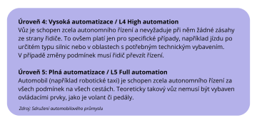 Vozidla v úrovni L4 a L5 budou podle ministra dopravy Martina Kupky schopna zcela samostatného provozu bez přítomnosti řidiče.