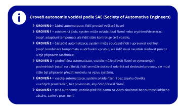 Důležité je zdůraznit, že podle platné legislativy se v České republice mohou provozovat pouze vozidla s podmíněnou automatizací, označovanou jako úroveň L3 podle mezinárodní škály SAE. To zjednodušeně řečeno znamená, že řidič musí být v autě stále přítomen za volantem a připraven převzít řízení.