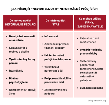 Průzkum projektu Neviditelní ukázal, že 39 procent lidí by při péči o svého blízkého ocenilo flexibilní pracovní dobu nebo zkrácený úvazek. Téměř polovina neformálně pečujících práci na plný úvazek nezvládá.