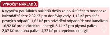 - náklady, které byly zahrnuty do vyjádření průměrné spotřeby, jsou plyn, elektřina, pevná paliva, dodávka tepla, centralizované poskytování teplé vody, dodávka vody z vodovodů a vodáren a odvádění odpadních vod, odvoz odpadních vod a čištění jímek a odvoz komunálního odpadu,