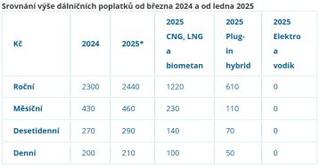 Jednodenní známka se od ledna 2025 navýší o desetikorunu na 210 korun, roční pak o 140 korun, a bude tedy k mání za 2 440 korun. Podle evropské směrnice bude nadále odpuštěn poplatek za používání dálnic pouze bezemisním vozidlům na elektrický pohon nebo na vodík.