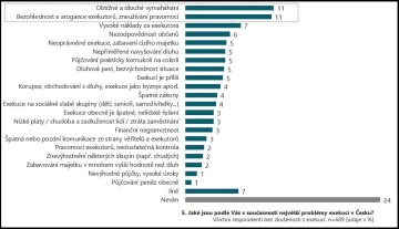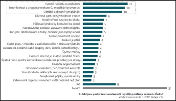 Nejčastěji lidé uvádějí vysoké náklady exekuce, které za problém považuje 11 procent občanů. Desetině Čechů vadí arogance exekutorů, stejný počet lidí pak kritizuje obtížnost a zdlouhavost vymáhání.