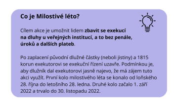 V prvním kole Milostivého léta, které se konalo od října 2021 do konce ledna 2022, zastavili exekutoři 42 tisíc případů. Zcela se exekucí zbavilo 15 tisíc lidí.
