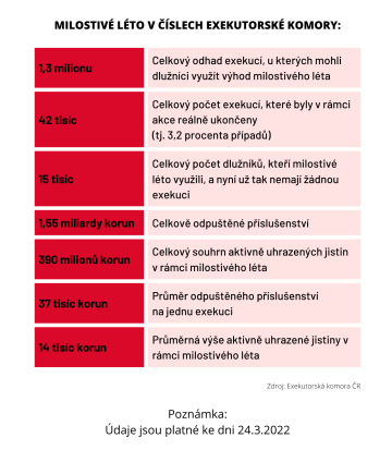 Milostivé léto zbavilo 15 tisíc lidí všech exekucí. Celkově bylo podle Exekutorské komory zastaveno 42 tisíc řízení. Tedy přibližně 3,2 procenta těch, kterých se akce týkala. Autoři zákona Marek Výborný (KDU-ČSL) a Patrik Nacher (ANO) se proti zveřejněným číslům ohradili. Tvrdí, že jsou neúplná a zavádějící.