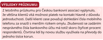 Banky si od této nové funkce kromě zrychlení a zjednodušení platebního styku slibují snížené množství chyb, které vznikají při vyplňování čísla účtu. ČNB na svých stránkách v rámci prevence proti finančním podvodům upozorňuje, aby klienti bank posílali peníze pouze lidem, které znají a důvěřují jim. Varuje především před nevyžádanými a potenciálně podvodnými žádostmi o peníze. Více informací o tom, jak se bránit finančním podvodům, najdete na vzdělávacím webu ČNB.