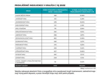 V prvním čtvrtletí roku 2022 obdržely soudy celkem 5 881 návrhů na insolvenci, což znamená meziroční pokles o 10,5 procent. Ubylo především žadatelů z řad fyzických osob, v případě firem naopak počet podaných insolvenčních návrhů mírně roste. Zatímco v prvních třech měsících roku 2021 bylo ze strany právnických osob podáno 270 insolvenčních návrhů, v prvním čtvrtletí letošního roku se číslo vyšplhalo na 286. Podle analýzy, kterou provedla společnost CRIF, se navíc v březnu oproti únoru zvýšil počet již vyhlášených bankrotů, a to ve všech kategoriích.