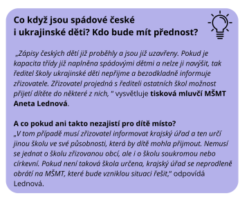 Z dostupných informací ovšem vyplývá, že v českých školách a školkách by měl být dostatek míst jak pro české, tak ukrajinské děti. V základních školách je dle Ministerstva školství připraveno pro (české i ukrajinské) prvňáčky celkem 150 tisíc míst. Do mateřských školek může být dle informací z Ministerstva školství přijato téměř 13 tisíc ukrajinských dětí.