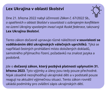 Zákonná podmínka zní, že každé dítě, které k 31. srpnu 2022 dosáhne 6 let, musí být přijato na základní školu. Základní školní docházka je ze zákona povinná nejen pro české děti, ale i pro ty ukrajinské, které jsou tu déle než 90 dní. Pro školky platí, že nárok na místo v mateřské školy vznikne od 3 let věku dítěte s tím, že od 5 let věku dítěte je docházka povinná.
