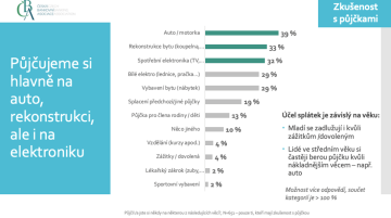 S nákupem na úvěr má v Česku zkušenost 59 procent lidí, přitom splacený ho má čtvrtina z nich. Celkově si za rok 2019 peníze půjčila necelá třetina populace. „Oproti minulému roku se zvýšil počet osob, které aktuálně splácí půjčku na 75 procent, což je o 10 procentních bodů více než loni. Jedním z faktorů obecně zvyšujícího se zadlužování může být dobrá ekonomická situace v Česku, a tím i lepší finanční situace Čechů, kdy se nebojíme zadlužit a na naši budoucí schopnost splácet se díváme velmi pozitivně,“ uvádí Helena Brychová, odborná gestorka finančního vzdělávání ČBA. Do této statistiky se přitom nepočítají hypotéky a úvěry ze stavebního spoření. S těmi má zkušenost 47 procent Čechů. Stejně tak statistika nezahrnuje kreditní karty či kontokorent, které si nadpoloviční většina lidí zřizuje pouze za účelem rezervy.
