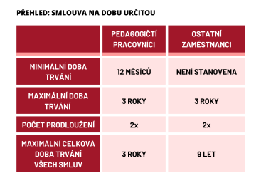 Smlouva na dobu určitou může být uzavřena maximálně na tři roky a prodloužena maximálně dvakrát, v součtu může takový zaměstnanecký poměr trvat až devět let. Poté už musí být se zaměstnancem uzavřena smlouva na dobu neurčitou. V případě že by uzavřena nebyla a zaměstnanec projevil vůli u zaměstnavatele dále pracovat (nejlépe písmeně), platí právní fikce, že se smlouva mění na smlouvu na dobu neurčitou. Minimální délka smlouvy na dobu určitou stanovena není, takže se může klidně jednat pouze o měsíc. Limit dvou prodloužení ale stále platí.