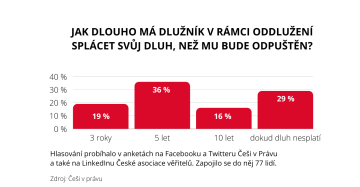 Jak dlouho má dlužník splácet v rámci oddlužení svůj dluh, než mu bude odpuštěn? Na tuto otázku jsme se ptali našich fanoušků na sociálních sítích. Nejvíce uživatelů hlasovalo pro variantu pěti let. Podstatná část respondentů je však přesvědčená, že by dlužníci měli svůj dluh splácet do té doby, než jej celý uhradí. Shrnutí výsledků hlasování, jež proběhlo na Facebooku a Twitteru Čechů v právu, jakož i na LinkedInu České asociace věřitelů, najdete v článku.
