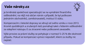 Snaha o dosažení finanční kompenzace za zpožděný či zrušený let může být v praxi poněkud spletitá. Pro úspěšné vyřešení situace je na místě obrátit se na odborníky. V Česku se problematice věnuje dlouhodobě portál Vaše nároky.cz, který kompenzace z letecké dopravy řeší již od roku 2013. Poškozený zadá svůj případ do online dotazníku a pracovníci zákaznické a právní podpory jej za něj vyřeší. Výše provize za tyto služby se pohybuje v rozmezí 5–25 % dle okolností případu. Pokud se kompenzaci na letecké společnosti vymoci nepodaří, klient za služby nic neplatí.